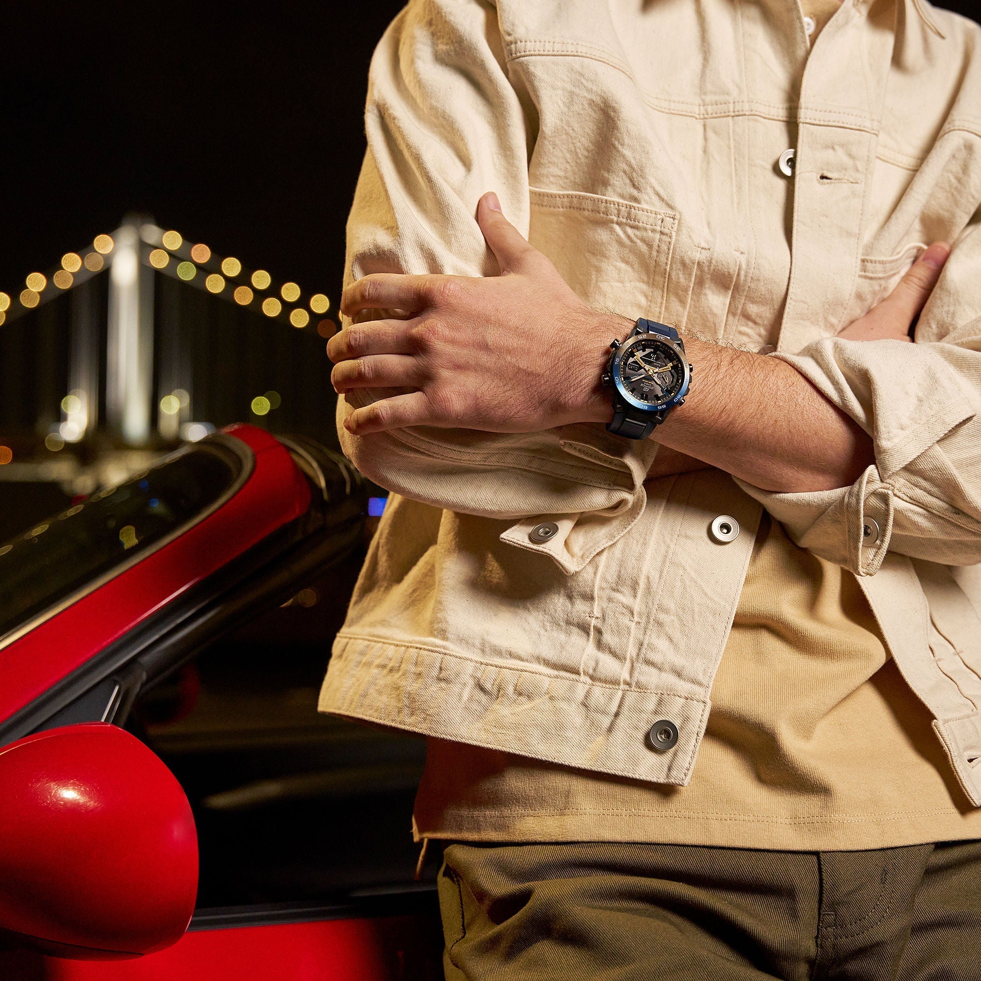 This nighttime take on the ECB-2000 SOSPENSIONE, a timepiece modeled on the configuration of a formula car suspension, features a carbon fiber-reinforced resin case for a lightweight comfort your wrist will love.