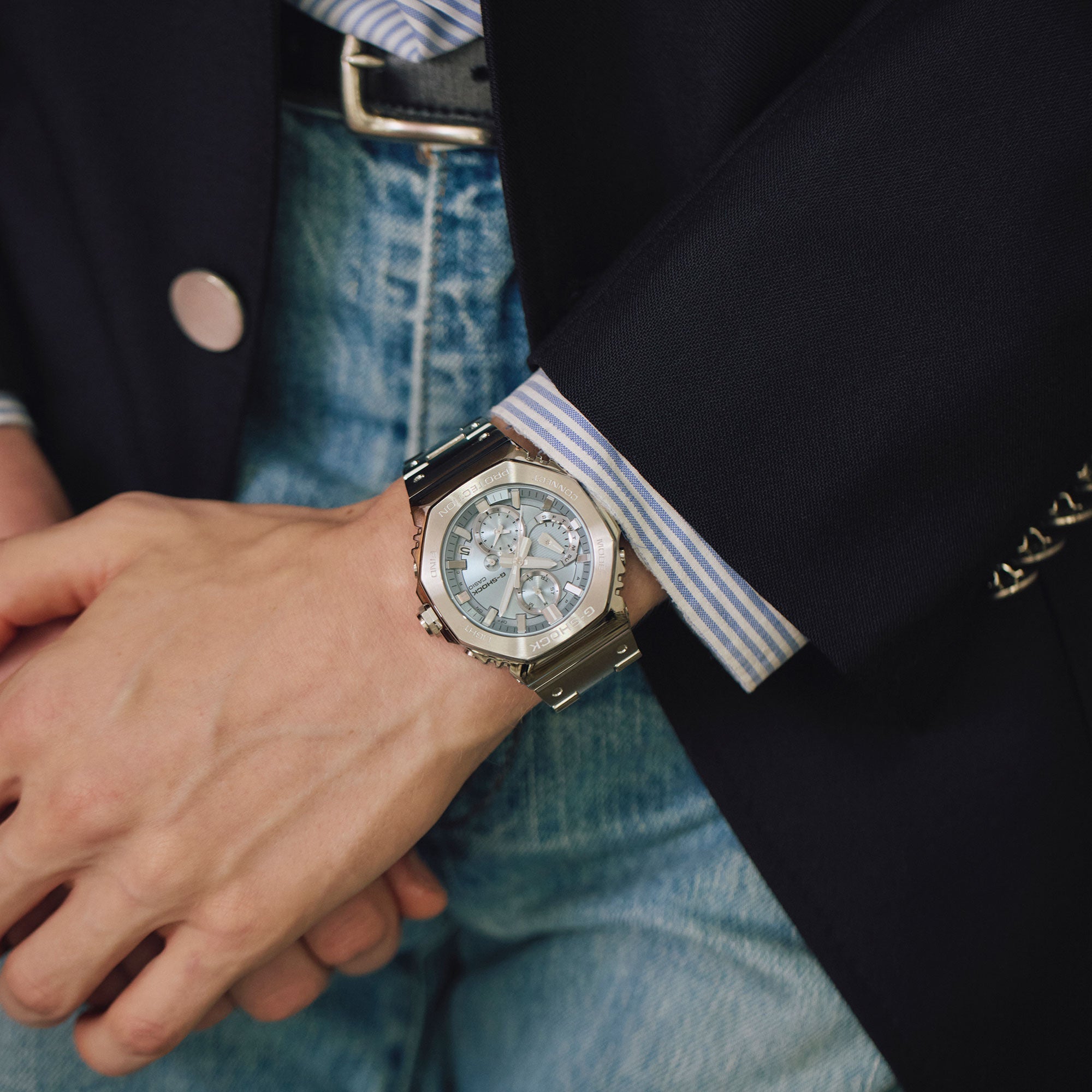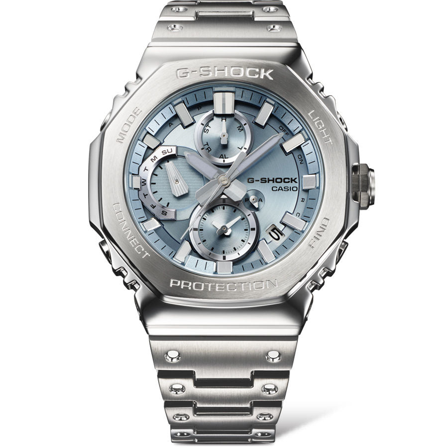 Introducing the full-metal chronograph addition to the continually evolving 2100 line of timepieces which inherit the legacy of the first-ever G-SHOCK, the DW-5000C. We take it way back with the octagonal bezel and dimpled band design of the original from 1983, but all done in metal with stainless-steel case, bezel, and band. Buffering components made of fine resin are installed between the bezel and the case for a shock-resistant structure with a full-metal exterior. The bezel — formed three-dimensionally in a time-consuming forging, cutting, and polishing process — is finished beautifully with a circular hairline treatment on the top surface and mirror polish on the slopes. The delicate molding and vapor deposition of Casio ultra-precision processing technologies add sophistication and quality to the indexes and inset dial rings. The screw-lock crown is designed in the same octagonal shape as the bezel for a more compact case with no sacrifice in outstanding G-SHOCK shock resistance. High-density mounting keeps the module slim, while still providing the advanced functions you love in a compact profile and comfortable fit. Pairs with a smartphone via Bluetooth®. Simply tap into the dedicated app for precision timekeeping that keeps you on track. With Tough Solar, a high-brightness LED light, and a range of other convenient functions, this is a timepiece that delivers both superior style and practical utility.