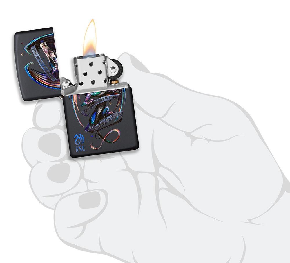 Enter the realm of fantasy with intricate artwork from Anne Stokes! A mighty multi-colored dragon stands firm in between a script that reads "Sometimes we need a little fantasy to help survive the reality." This mythical design is color imaged on a Black Matte lighter. Comes packaged in a gift box. For optimal performance, fill with Zippo lighter fuel.
