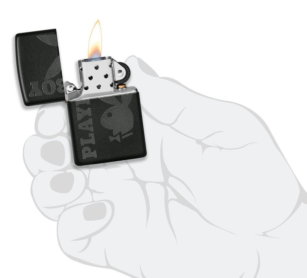 Front shot of Playboy Logo Black Matte Windproof Lighter standing at a 3/4 angle