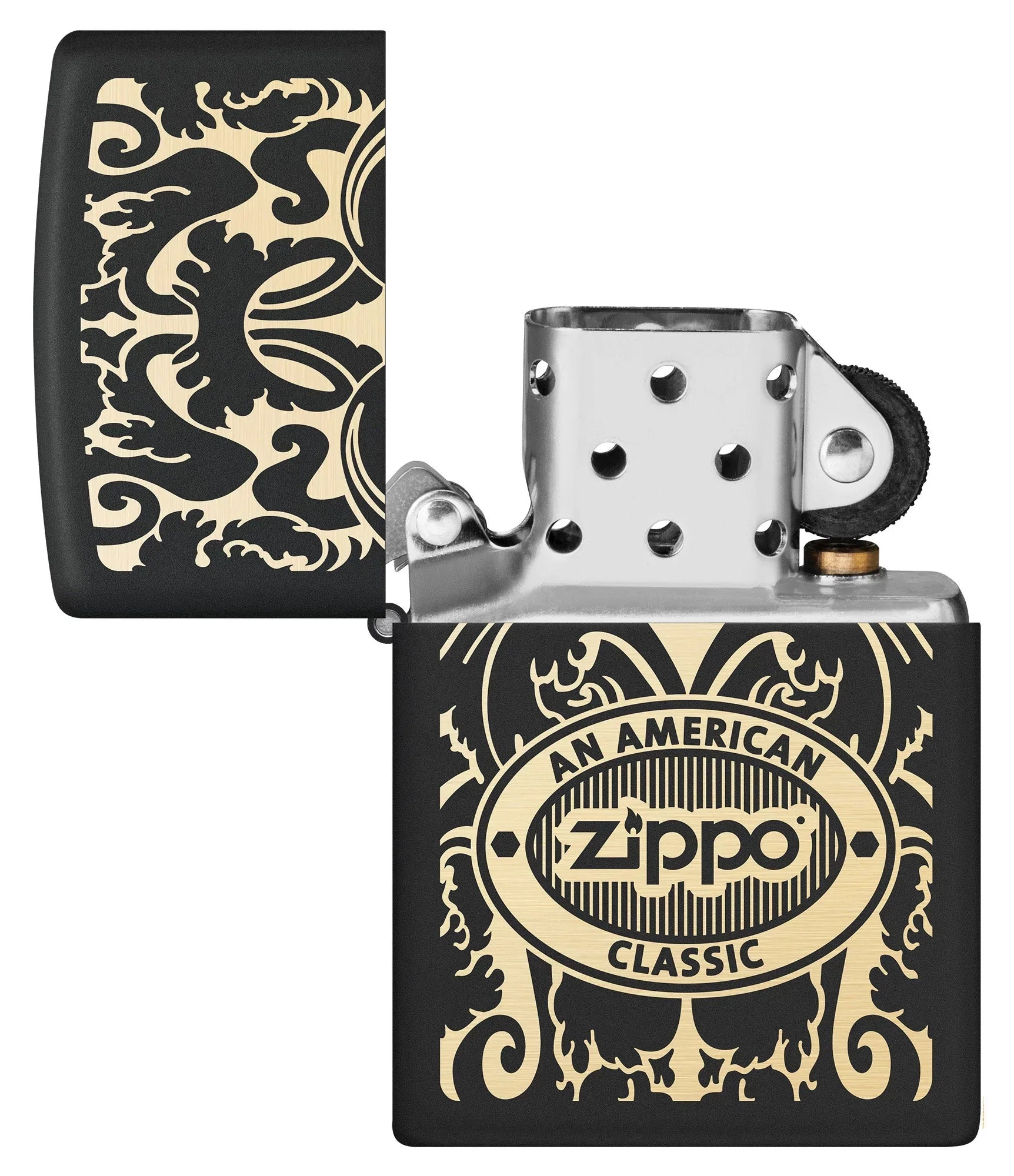 Nothing says American Classic like this sophisticated Black Matte lighter. The Zippo logo is the focal point of this dazzling design, while elegant filigree swirls across the deep black surface. Comes packaged in a gift box. For optimal performance, fill with Zippo lighter fuel.