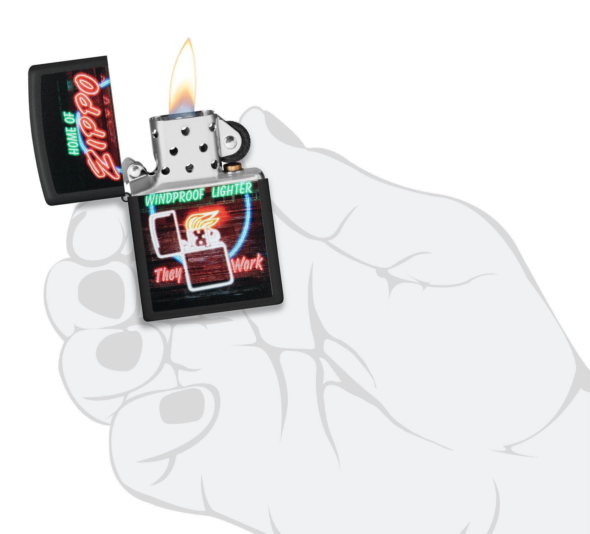 Front shot of Neon Sign Design Black Matte Windproof Lighter standing at a 3/4 angle.