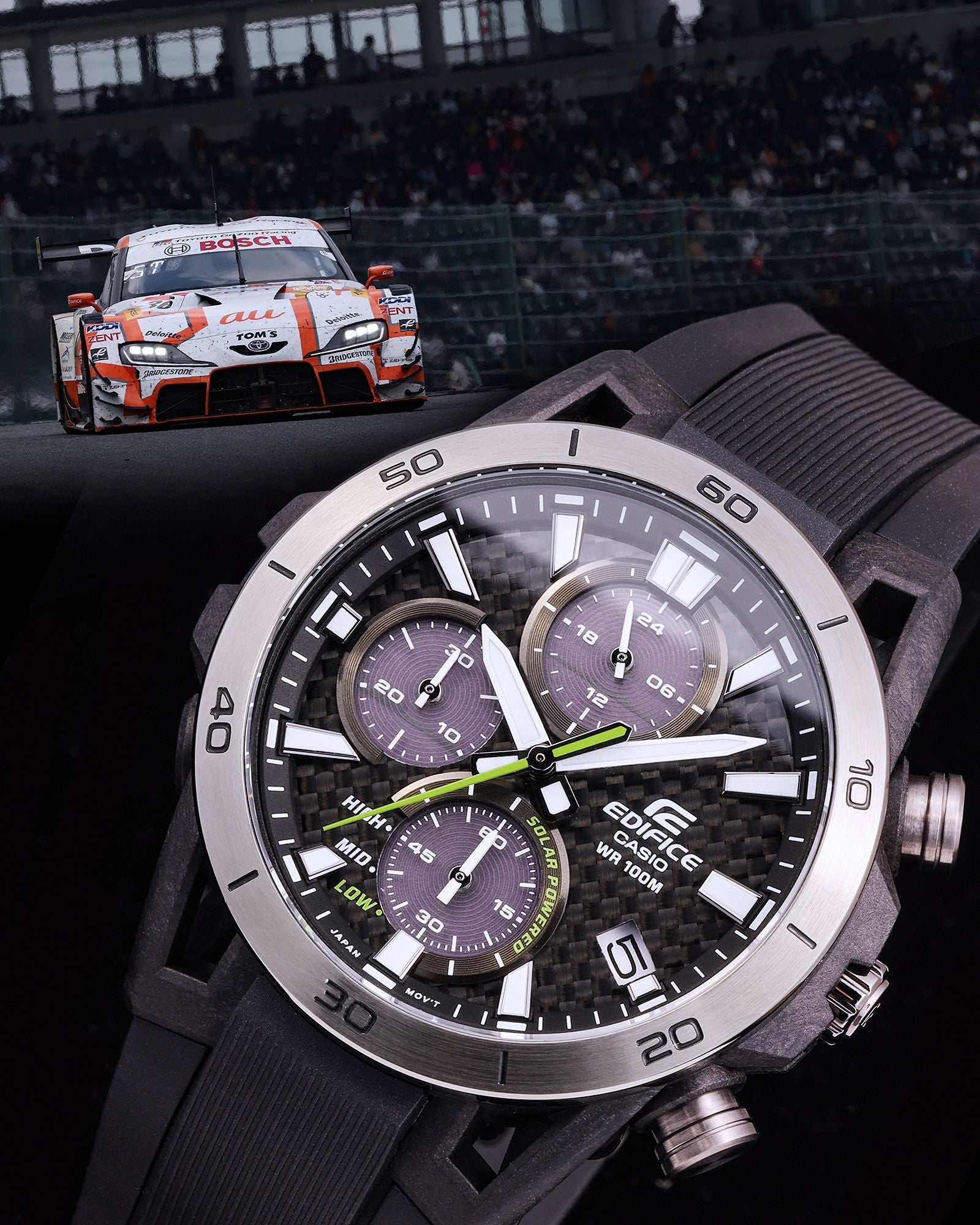 Fine-tune your style and sophistication with a solar-powered chronograph boasting a carbon fiber-reinforced resin case with a suspension arm design, plus a carbon fiber dial.