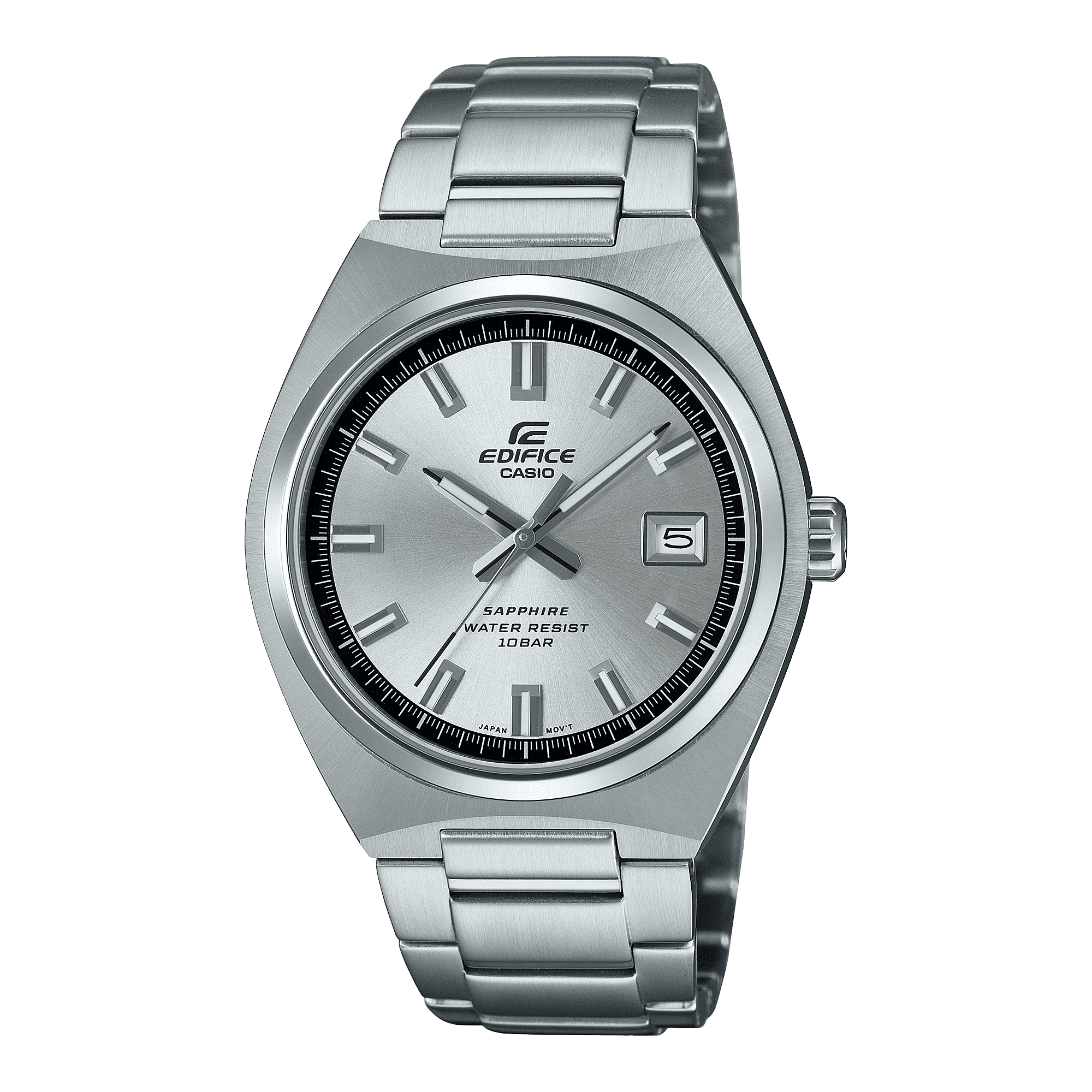 Introducing an EDIFICE motorsports analog timepiece with hour, minute, and seconds hands design, inspired by the classic sportscar. The slender, mirror-finished bezel and round stainless-steel case featuring a radiating hairline finish create a unique pairing for a classic look with a solid feel. The EFB-109D-1A dial takes on a bright glossy black, accented with a touch of red on the seconds hand. The blue dial of the EFB-109D-2A and the silver dial of the EFB-109D-7A are each finished in a sun-ray design with fine lines that radiate out from the center. With the substantial stainless-steel band, sapphire crystal, and 100-meter water resistance, you’re ready for anything that comes your way. This sporty, classic timepiece takes you instantly from casual settings to business meetings in unique style.