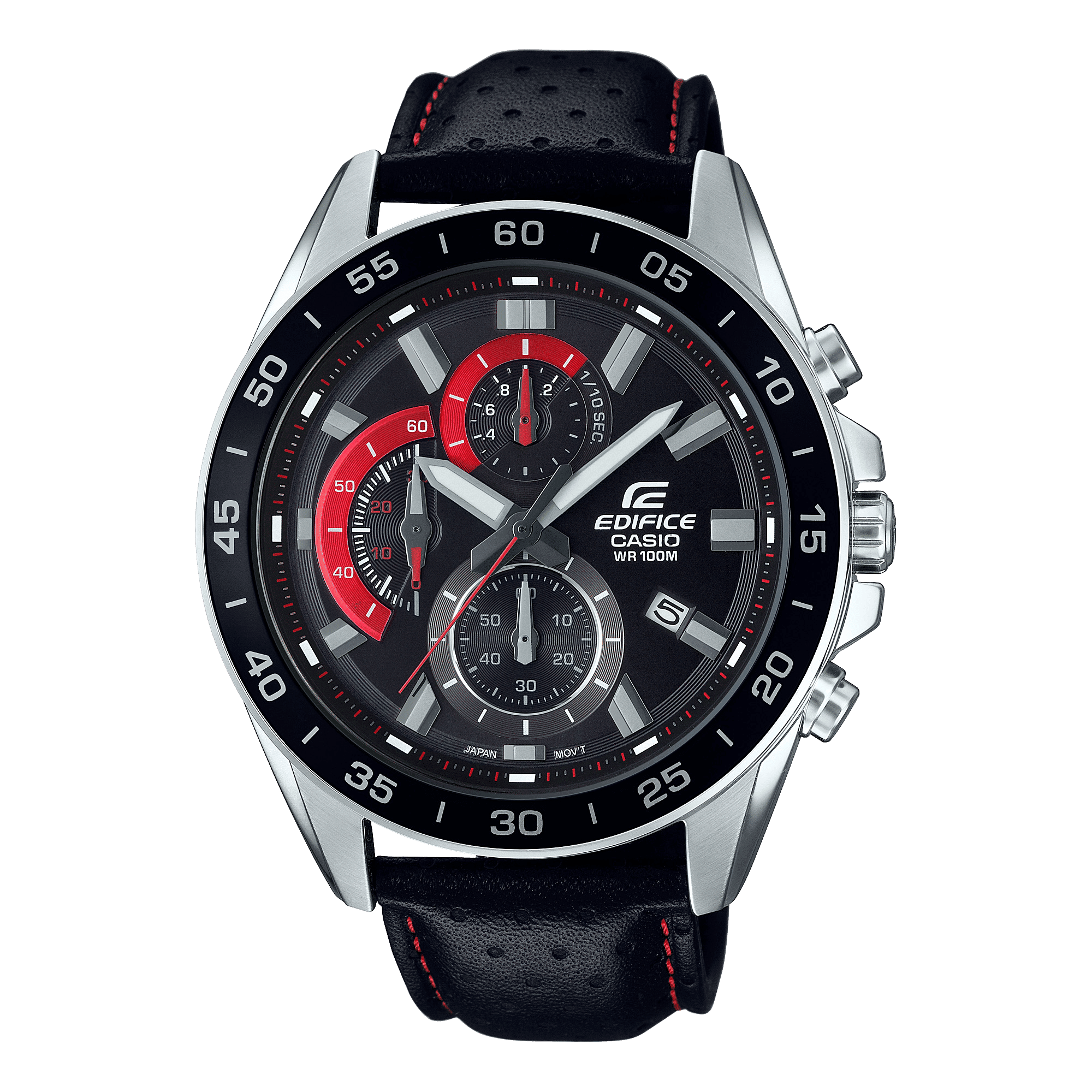 A large standard EDIFICE chronograph. Use of an extra-thick inset dial creates a powerful, dynamic design. Uses a genuine leather band.