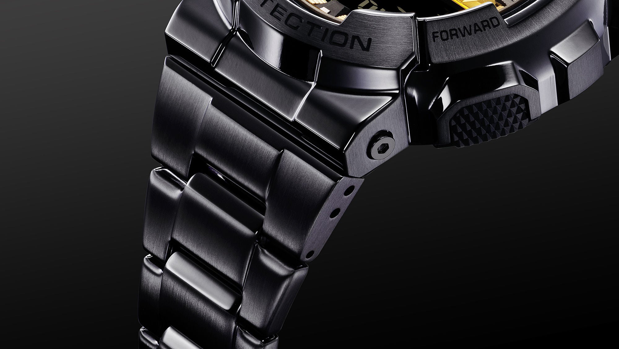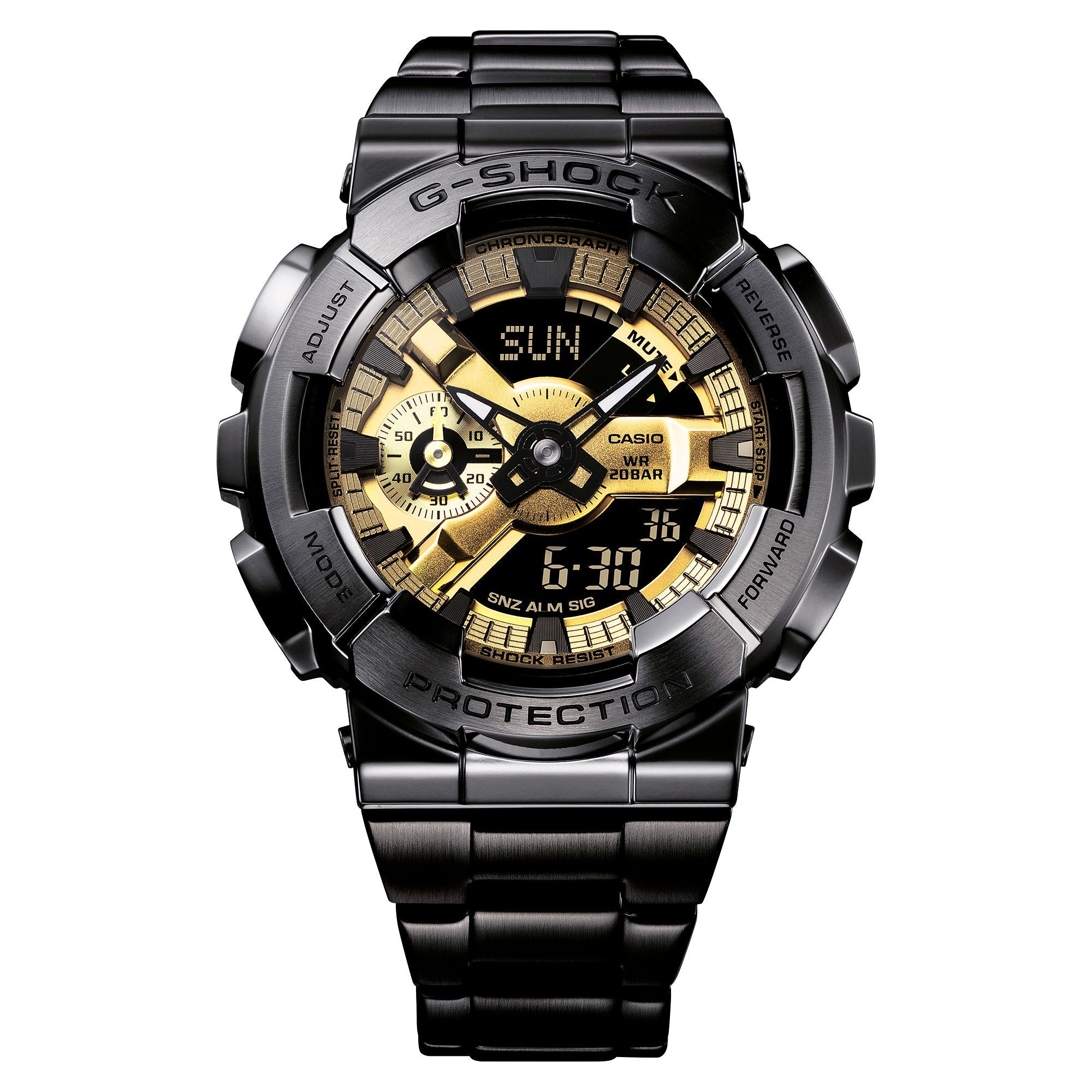 Introducing the GM-110BD, an updated take on the ever-popular large case analog-digital G-SHOCK with metal bezel and band. Precision forging, cutting, and polishing, and even special molding techniques, all go into crafting a metal bezel featuring a rugged, high-impact design, for a solid construction that sacrifices nothing in toughness. The case is made of fine resin to protect the module. With a metal band, all-black ion plating, and dial in a gold color, the GM-110BD-1A9 is up for anything — work or play.