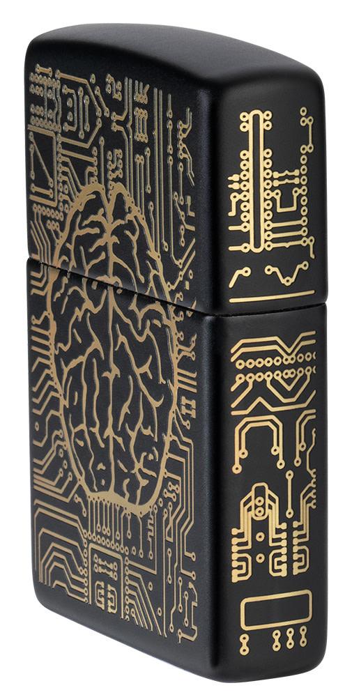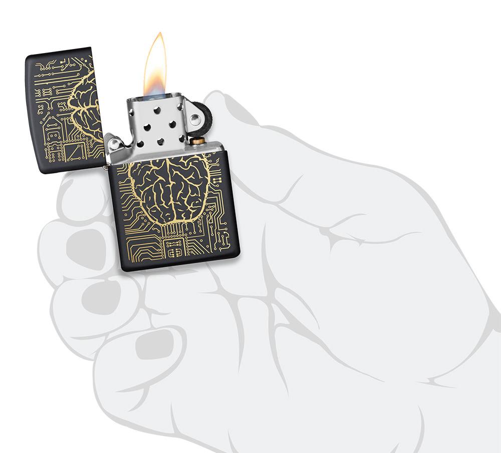 Some say that artificial intelligence will one day take over the world. Where that has yet to happen, AI has taken over this Black Matte Windproof Lighter. At the front and center of this design is a brain with electronic circuits creating a circuit board that wraps around all sides of the lighter. Purchasing this new design is your choice, but this lighter has a mind of its own. Comes packaged in a gift box. For optimal performance fill with Zippo lighter fuel.