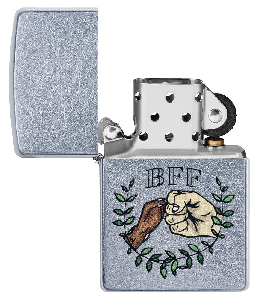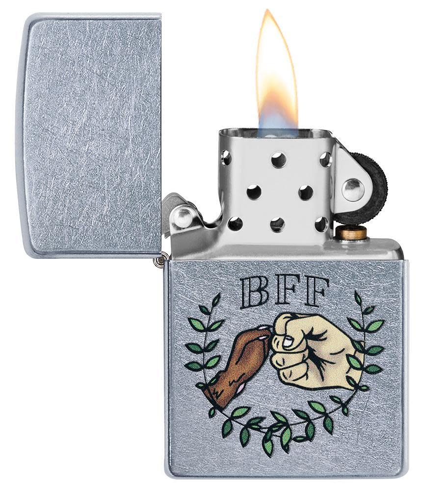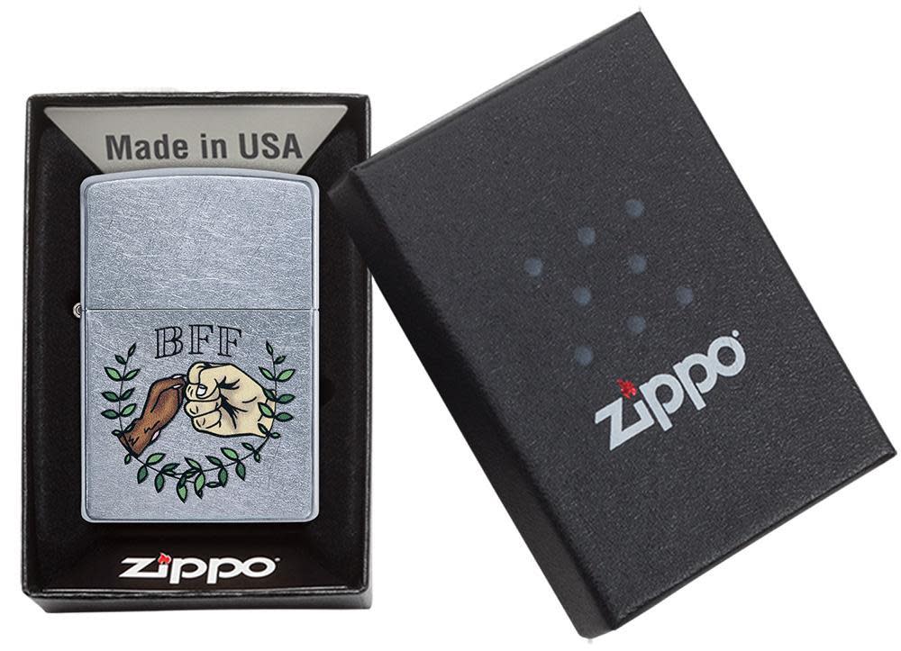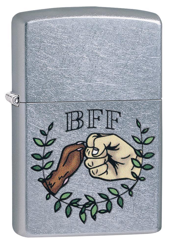 Celebrate your friendship with your furry BFF with this Street Chrome lighter. This design shows man and dog giving a bump, enveloped by a laurel wreath. Using color imaging, this piece perfectly encompasses the bond between man's best friend and their owner. Comes packaged in a gift box. For optimal performance, fill with Zippo lighter fuel.