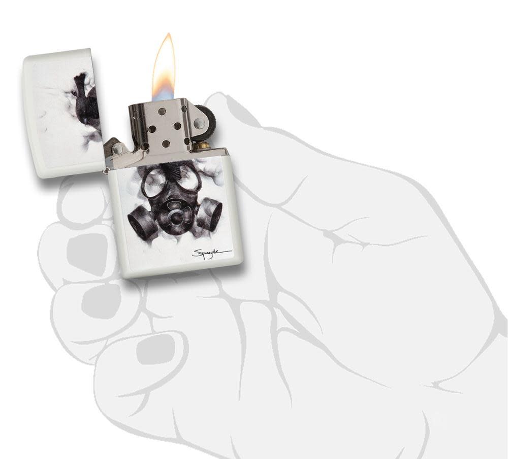 Long-time Zippo lighter owner, Steven Spazuk, is a Canadian artist who specializes in the fumage technique, using fire to create hyper-realistic, yet dream-like drawings. This year, Zippo teamed up with Spazuk to offer several brilliant reproductions of his most remarkable pieces on a the surface of a white matte windproof lighter. This model features a black bird resting on a smokey gas mask. Comes packaged in a gift box. For optimal performance, fill with Zippo lighter fuel.