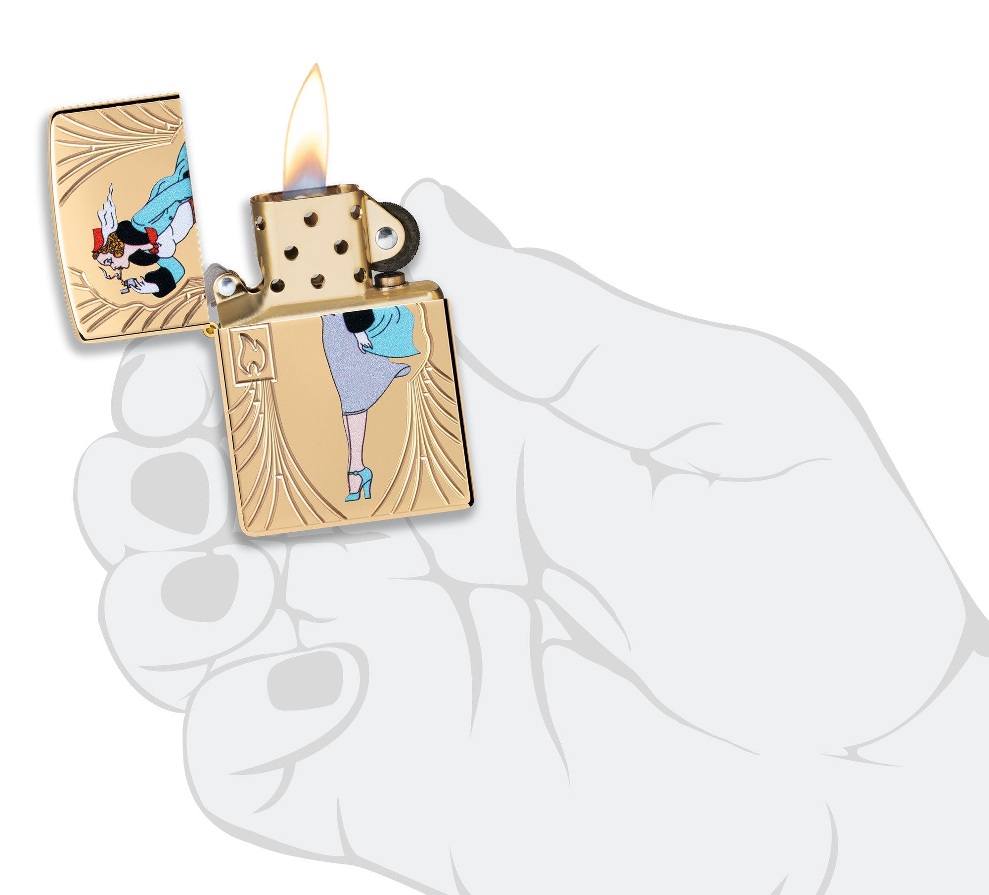 Front shot of Zippo Windy 85th Anniversary Collectible Armor High Polish Brass Windproof Lighter, standing at a 3/4 angle.